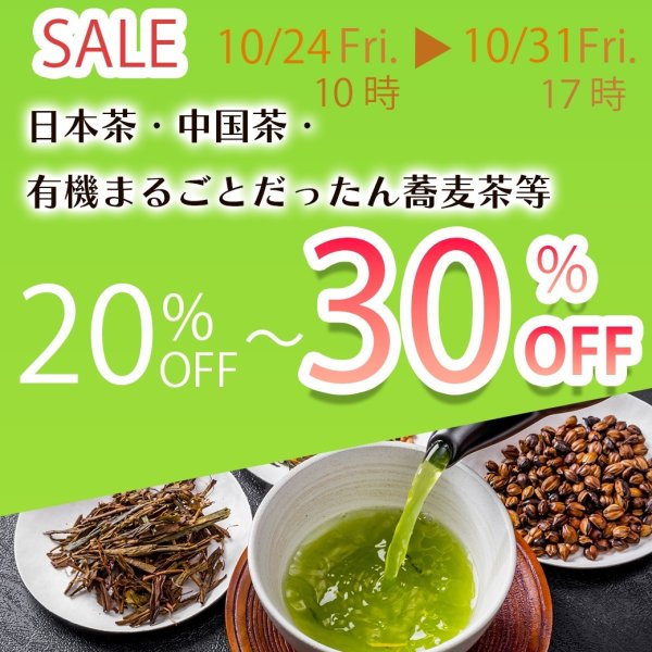 人気の国産カフェインレス緑茶やカフェインレスほうじ茶、有機まるごとだったん蕎麦茶、有機国産まろやか五穀麦茶など人気のお茶が20%off!